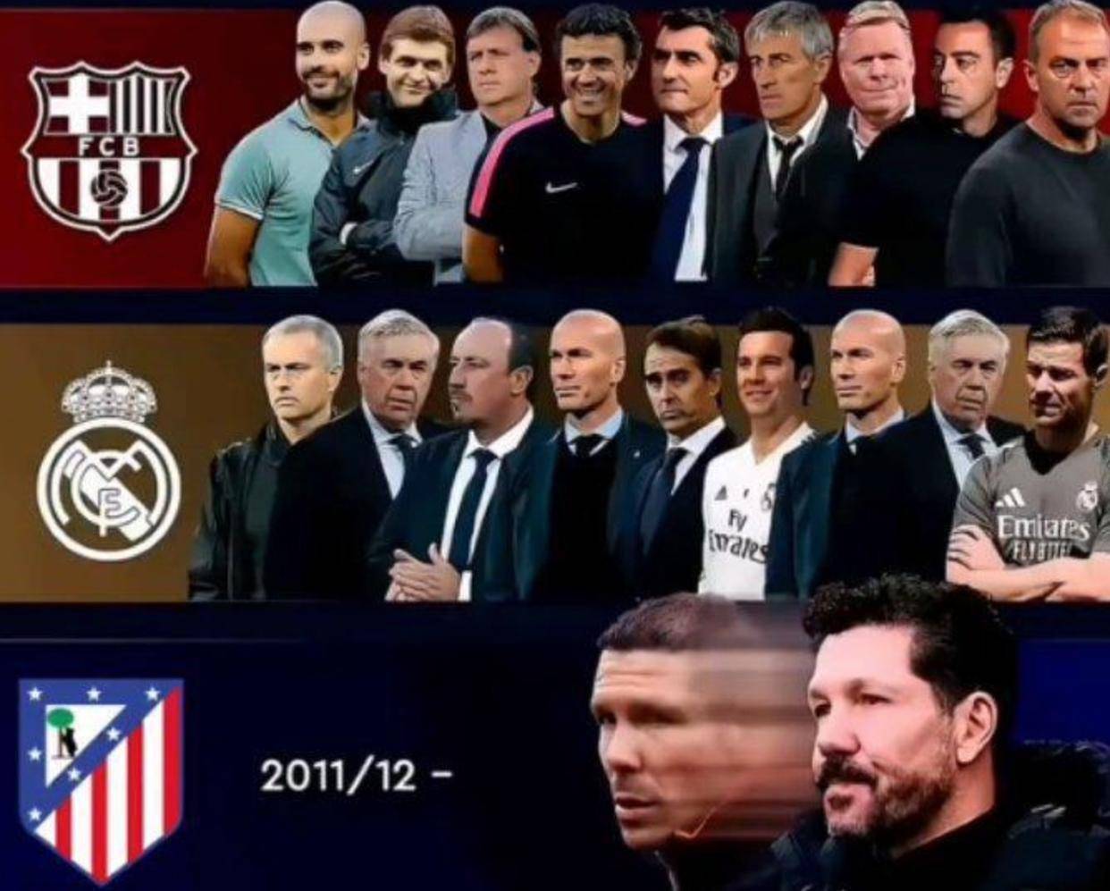 从2011年到2025年,西甲联赛在十四年间经历了翻天覆地的变化,皇家马德里和巴塞罗那的教练席位也如同走马灯般更换着一位又一位名帅。然而,在马德里竞技的教练席上,始终坚定地坐着同一个人——迭戈·西蒙尼。